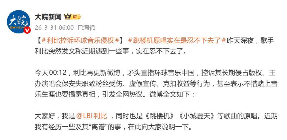 3月31日凌晨,一首《跳楼机》直接把原唱歌手LBI利比送上了舆论的“跳楼机”。他在社交媒体连发长文,矛头直指行业巨头环球音乐中国,控诉其版权侵占、巡演纠纷及霸王条款等问题,直言“忍无可忍”,甚至不惜赌上自己的音乐生涯也要揭露真相,瞬间点燃了全网热议。