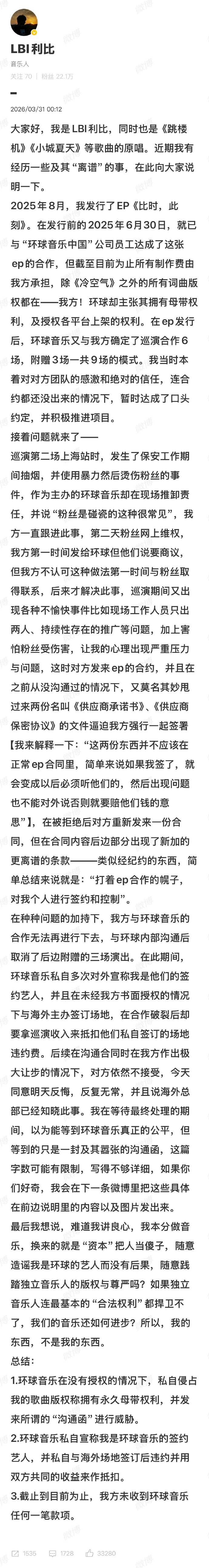 这场风波始于一个深夜的爆发。利比先是发文称遇到一些事“实在忍不下去了”,随后在零点刚过便放出“实锤”,将矛头对准环球音乐中国。他自行总结的三点控诉,条条直指合作核心的“命门”。