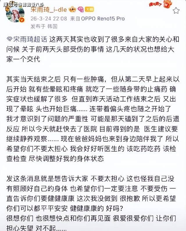 据悉,宋雨琦此次受伤并非意外,而是在3月21日(G)I-DLE曼谷巡演的舞台上,表演高强度舞蹈时不慎撞到舞台道具,当场出现头晕、恶心等症状,随后被紧急送往医院检查,经诊断为头部撞击后遗症,伴有持续性眩晕、偏头痛等症状,医生建议其停工静养至少两周,避免剧烈运动和过度劳累。