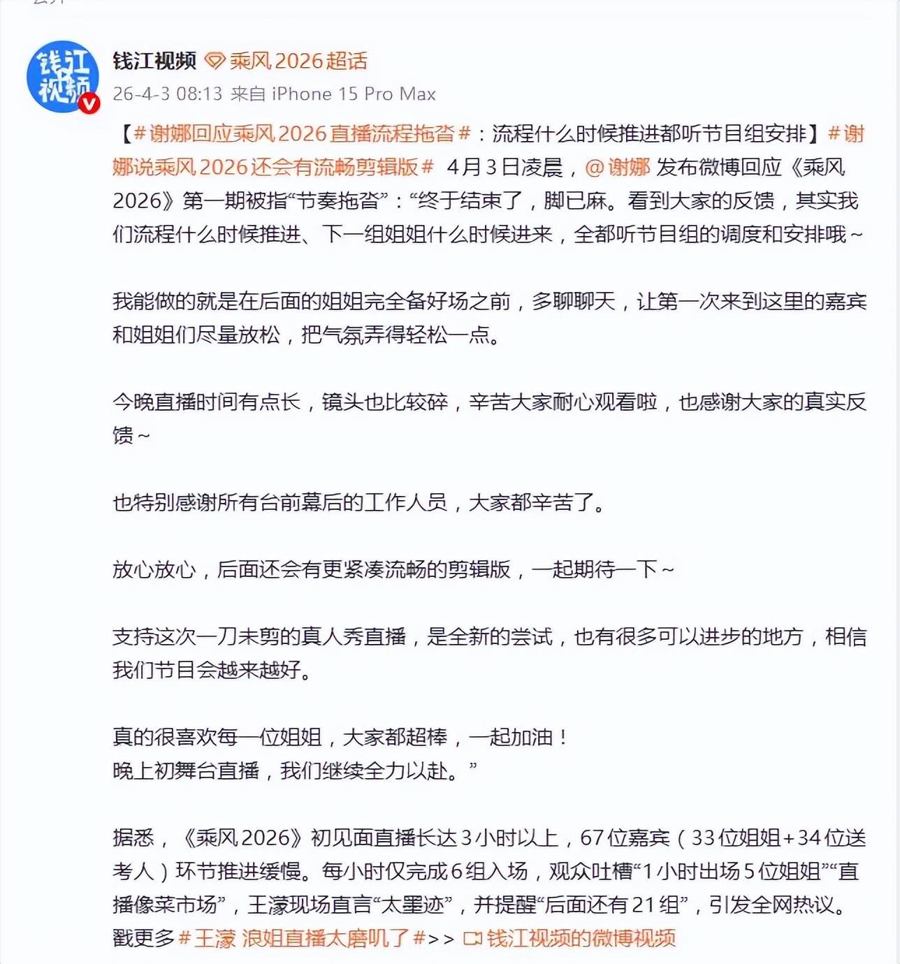 4月3日凌晨,谢娜的一条微博回应,给热议的《乘风2026》“直播节奏慢”添上了解释。面对首期初见面直播被观众吐槽“节奏拖沓”、“像菜市场”的声浪,这位核心主持人终于站出来,用“全都听节目组的调度和安排哦”的回应,为这场持续发酵的争议降温。
