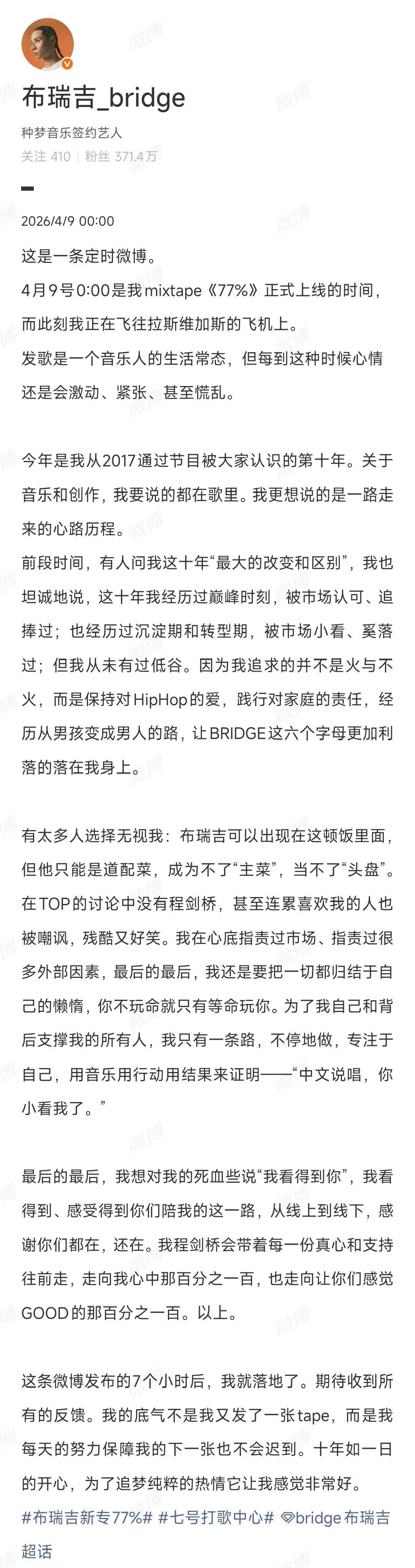 同时,布瑞吉还发布长文走心谈十年感受!