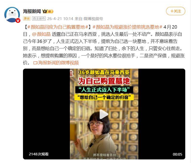 “提前为自己选一块墓地,并不意味着告别。”颜如晶在视频中清晰阐述了自己的动机。她将这一行为定义为对人生下半场的主动规划,核心目的并非沉溺于终点,而是想通过确定一个“归宿”,来换取内心的安定感。在她看来,明确了生命的最终坐标,反而能卸下对未知的焦虑,“知道了归处,余下的人生,只管安心往前走。”这种“向死而生”的哲学,成了她面对36岁这个人生分水岭的独特仪式感。