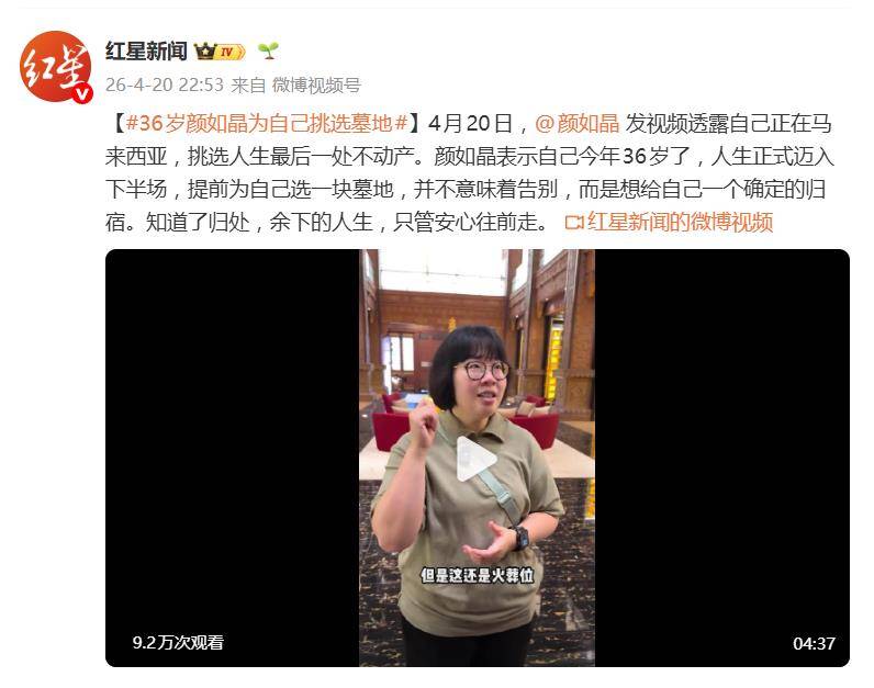 据4月20日晚间报道,脱口秀演员颜如晶发布的一则视频,在平静的日常里投下了一颗“深水炸弹”。视频里,身在马来西亚的她,坦然向观众展示着自己正在做的一件大事——为自己挑选一块墓地。这位36岁的公众人物直言,自己的人生已正式迈入下半场,而提前规划“人生最后一处不动产”,是她深思熟虑后的决定。